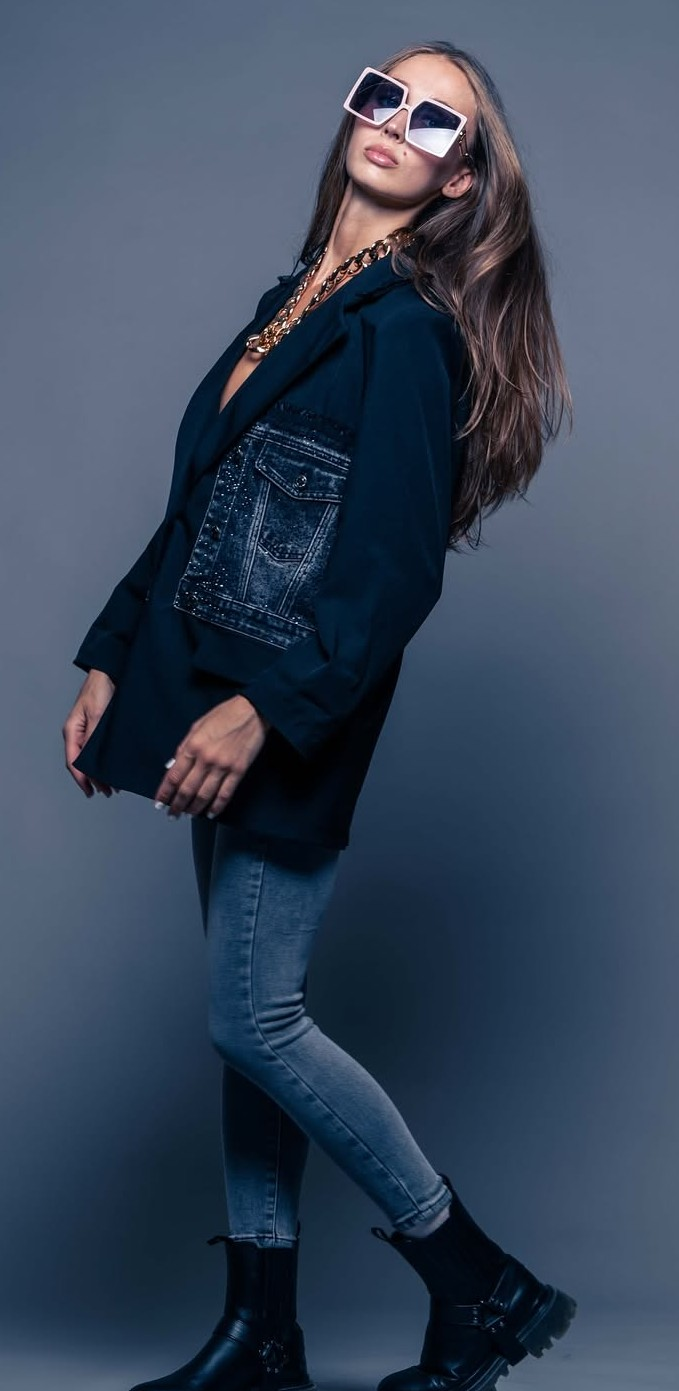 An exclusive Italian design that fuses classic tailoring with edgy denim flair. This structured black blazer is enriched with washed denim panels and subtle crystal accents for a refined yet modern touch. A perfect statement piece to elevate any outfit — from casual denim to sleek eveningwear.