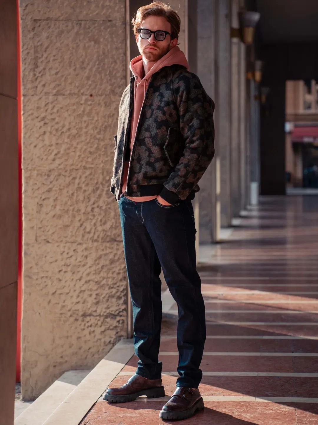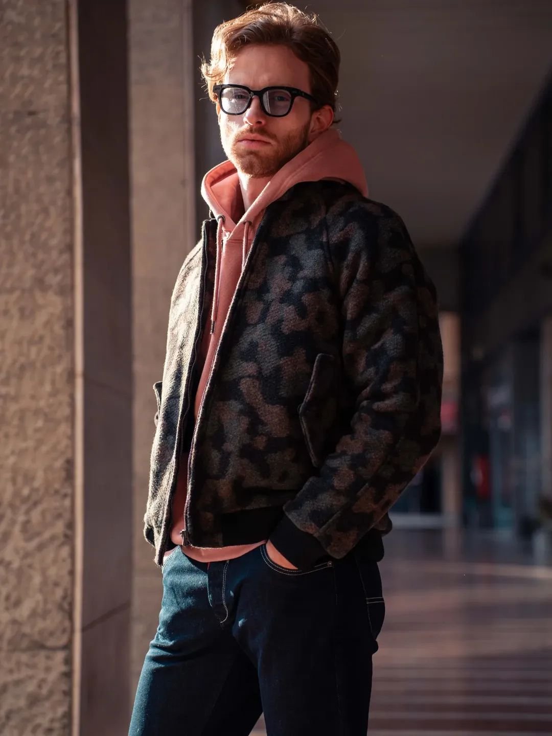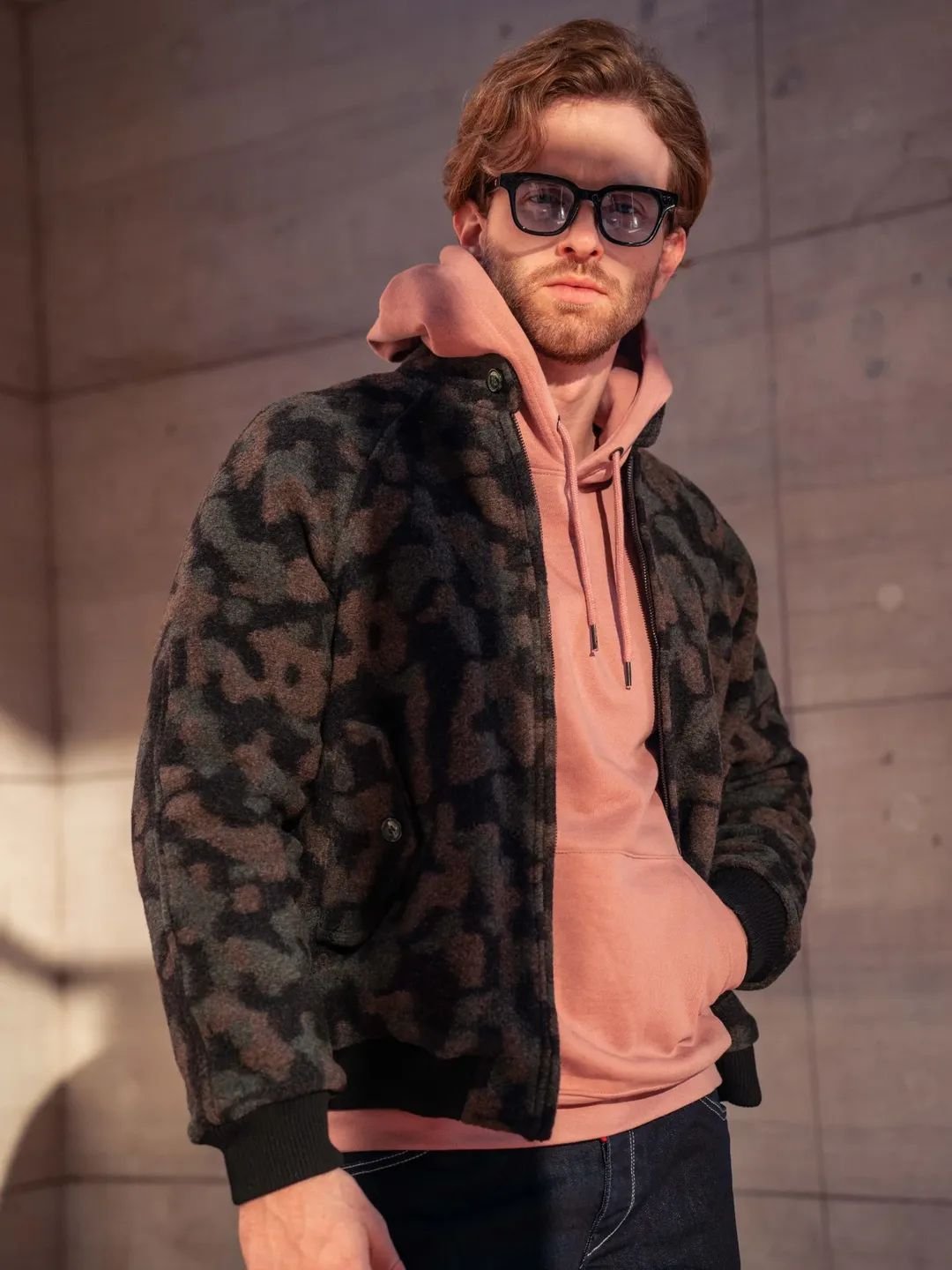 Wool bomber jacket with subtle camouflage print and modern fit.