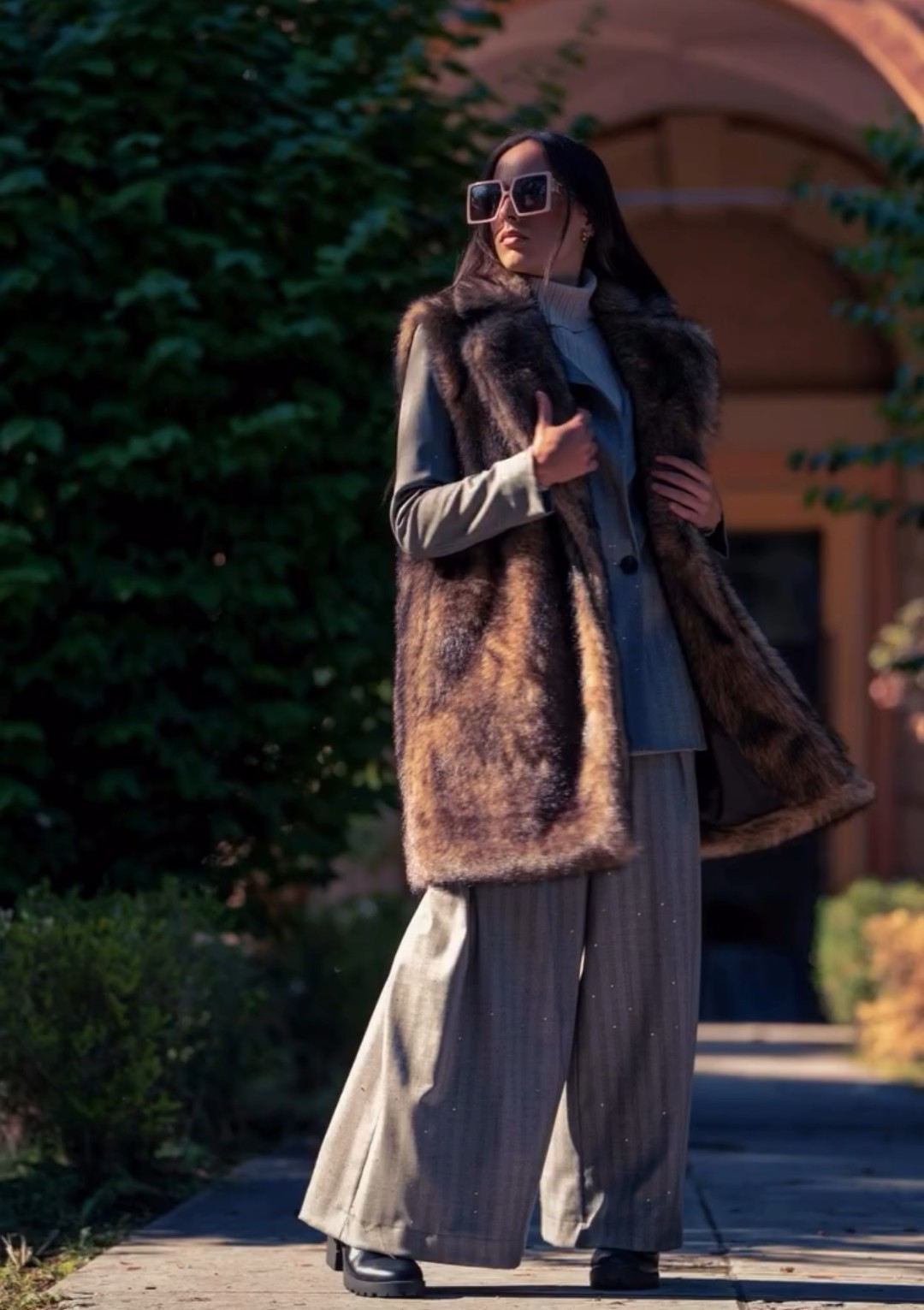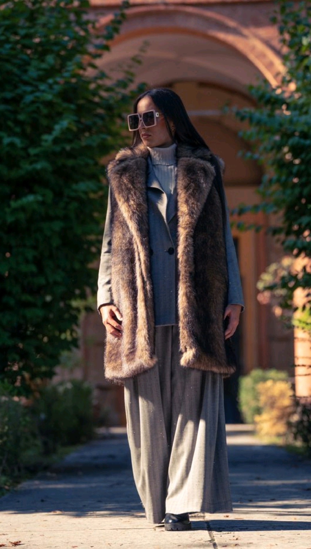 The wide-leg trousers flow effortlessly, creating an elongated silhouette and ensuring comfort while maintaining elegance.