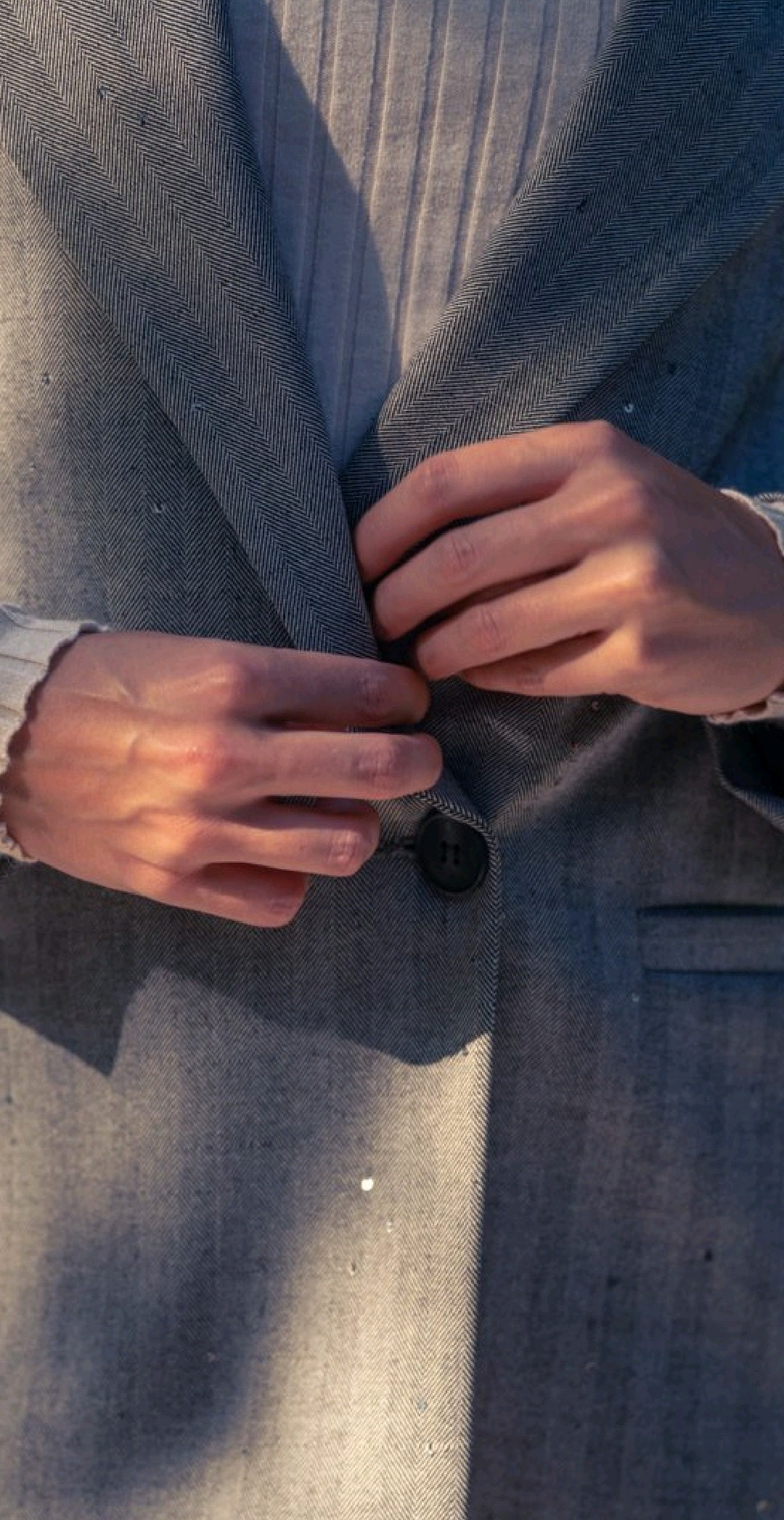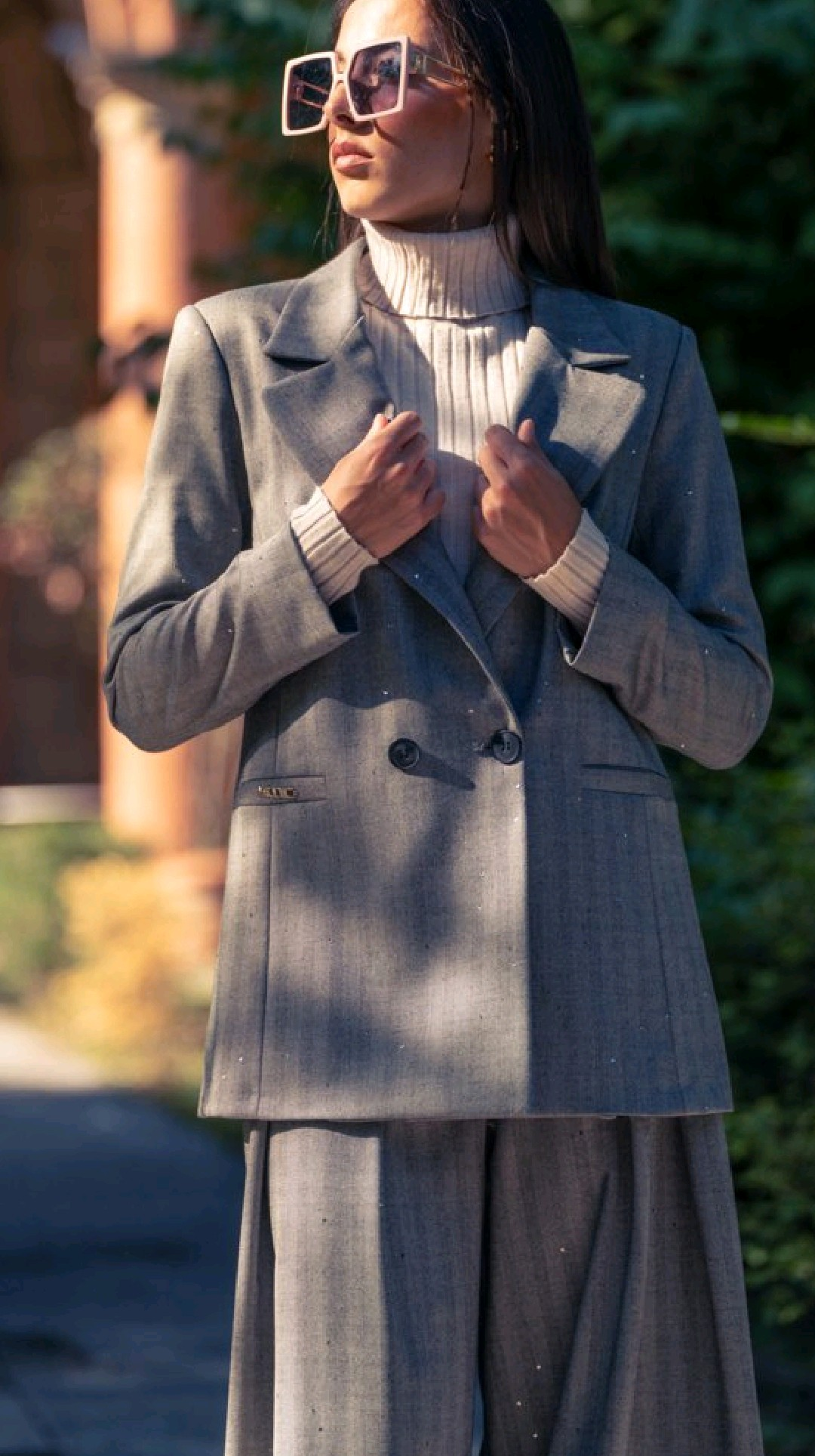 This elegant two-piece grey suit is crafted from fine fabric in a delicate herringbone pattern. The classic double-breasted blazer features structured shoulders, a tailored silhouette, and pockets, offering a timeless and sophisticated look. What makes this suit truly unique are the subtle sparkling sequins sewn into the fabric — they catch the light beautifully, adding a refined touch of glamour without being overwhelming.