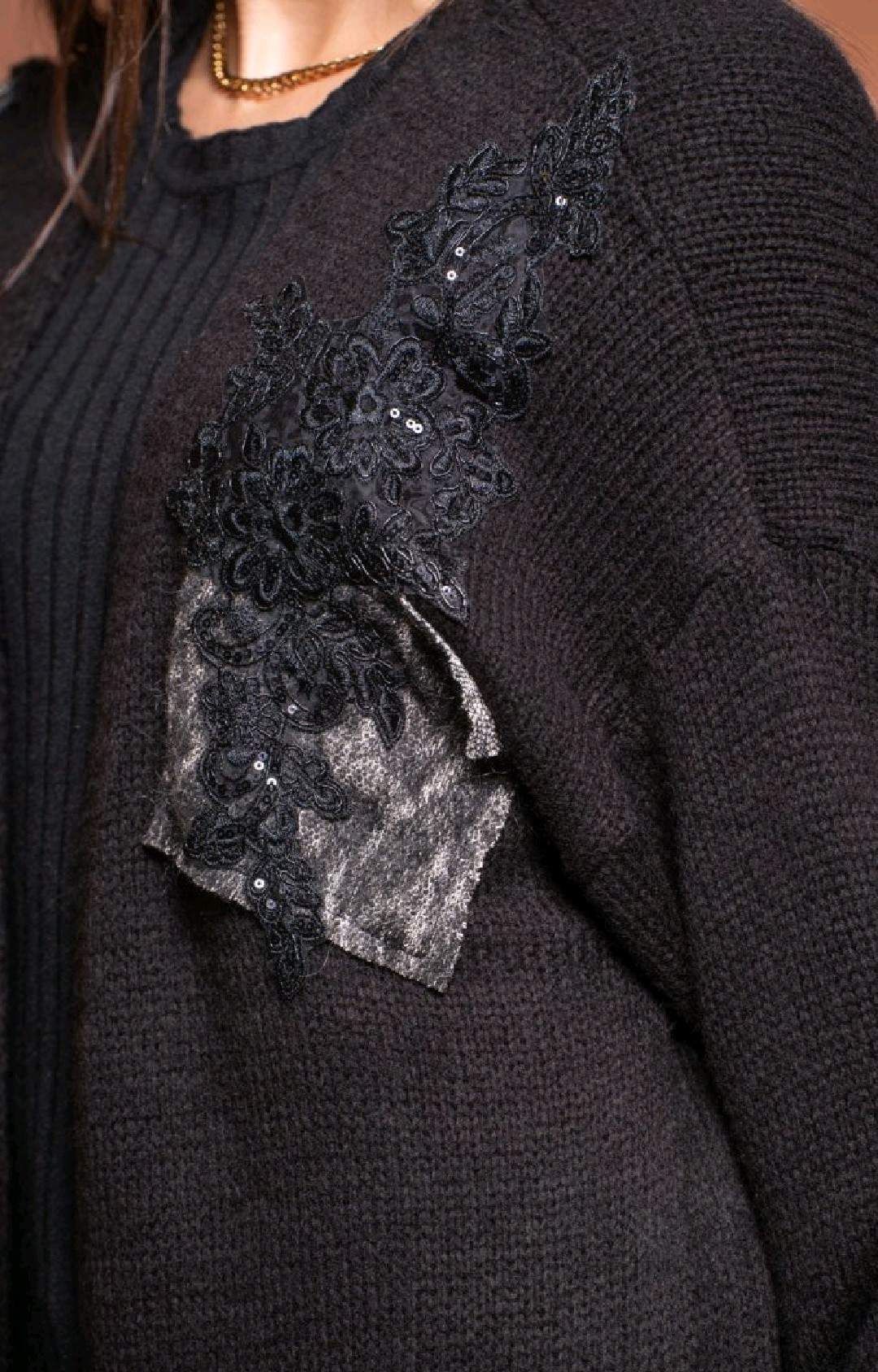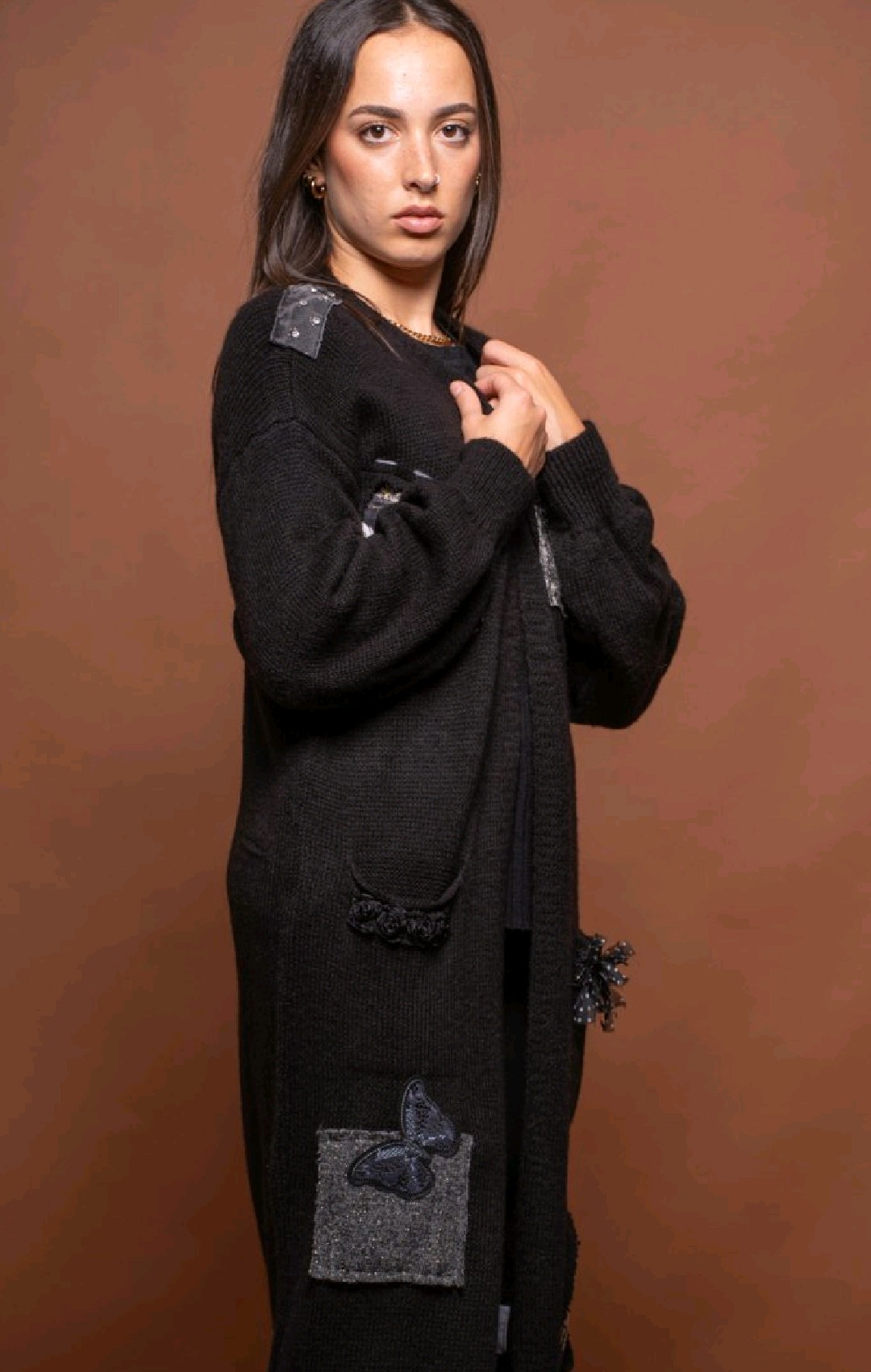 Elegant long black knit cardigan featuring unique appliqué and lace embellishments with sequin accents. Open-front design with patch details, including a butterfly motif, adding a touch of individuality and texture.