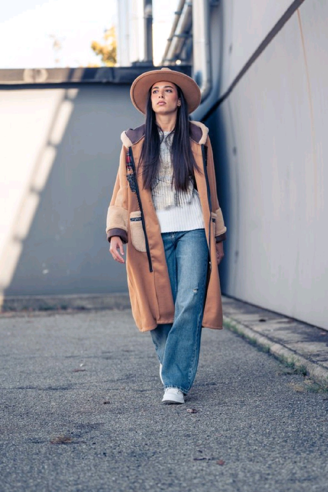 Designer camel coat with faux fur hood,patchwork details,and oversized pockets.