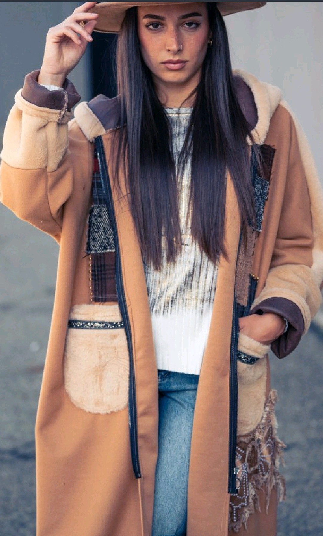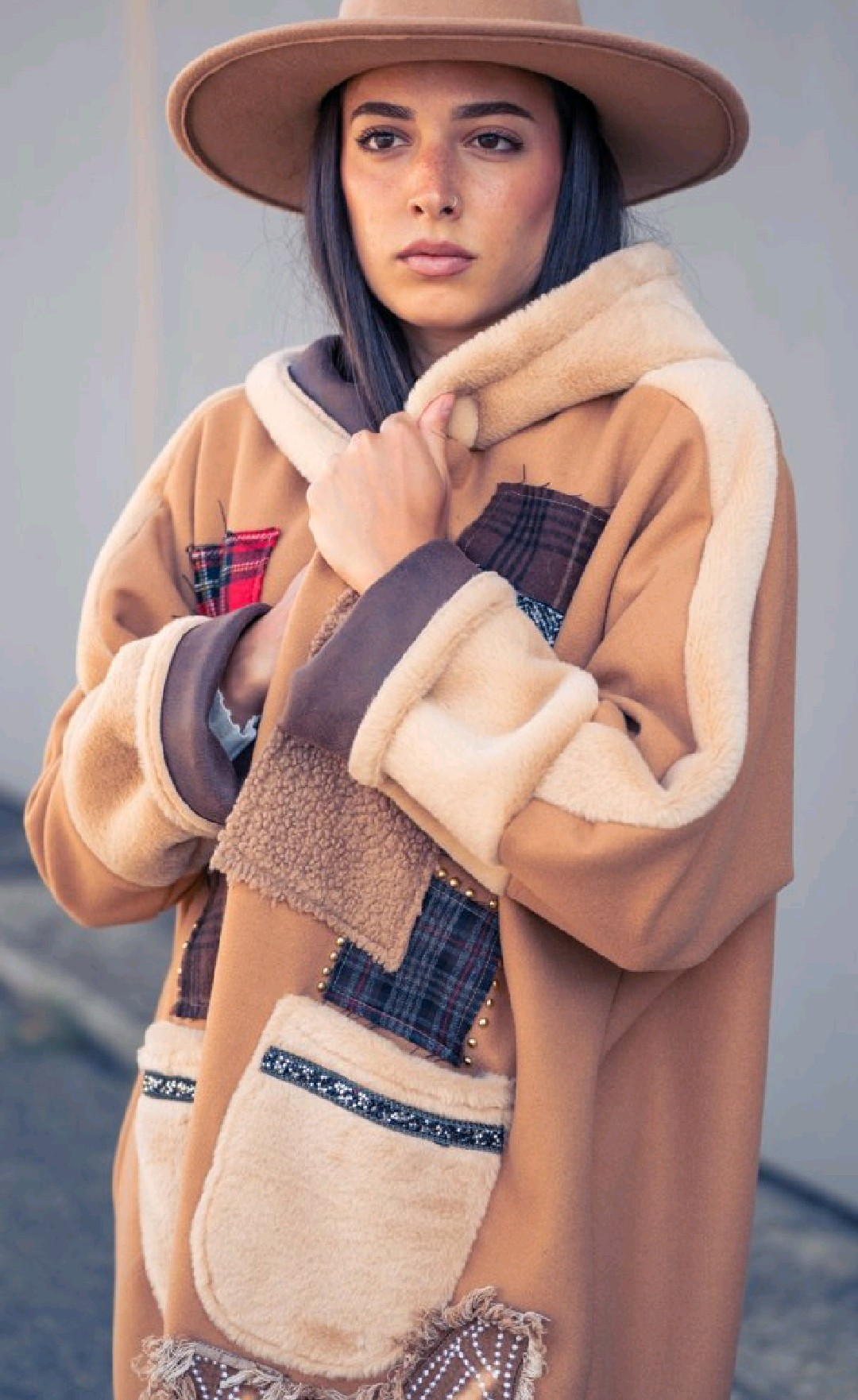 Unique designer coat in warm camel tones,enriched with faux fur panels,plaid patchwork,and hand-crafted embellishments. Featuring oversized pockets,and a relaxed silhouette,this statement piece blends comfort with artistic detail. Perfect for those who seek individualyti and elegance in their everyday style.