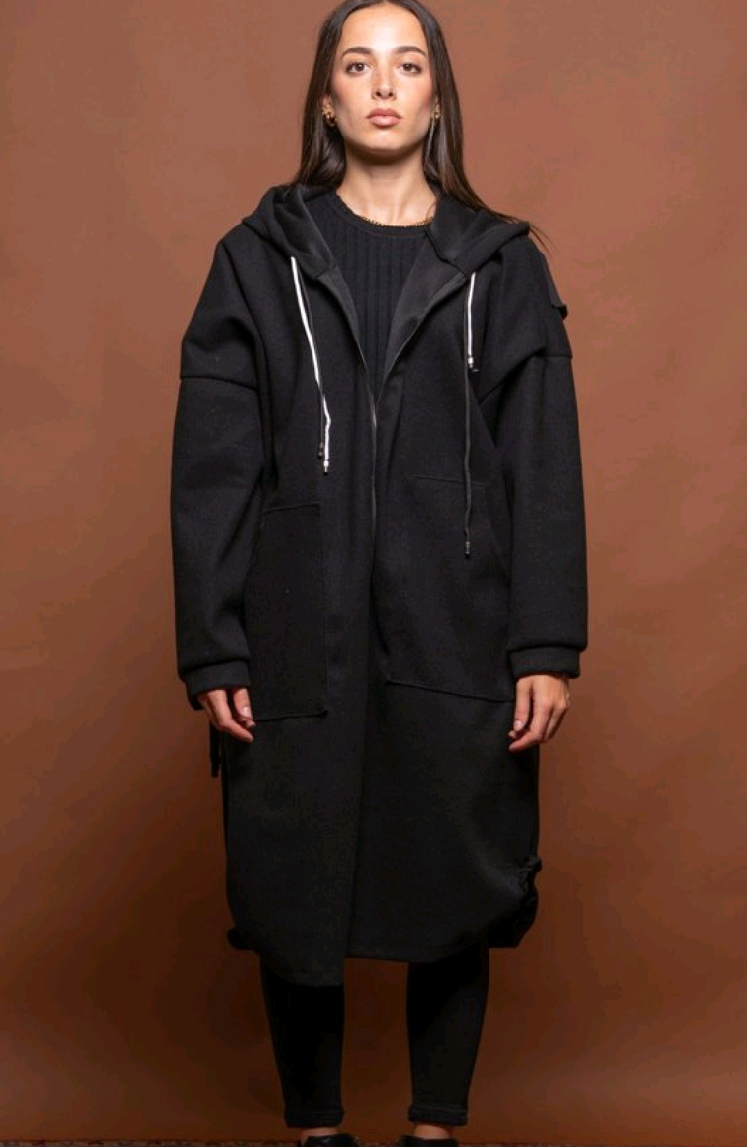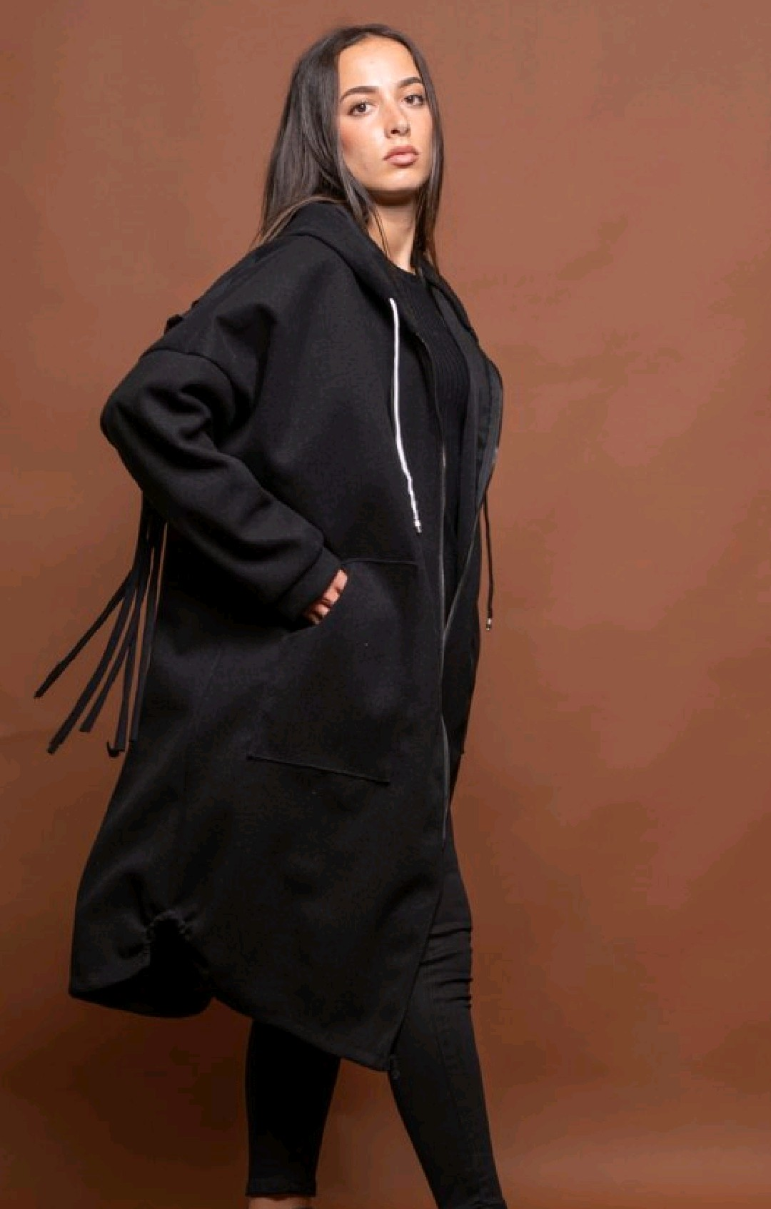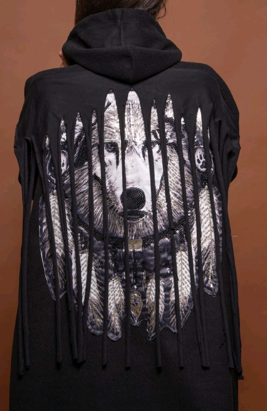 Black oversized coat with hood and drawstring details. Features front patch pockets and a striking back design – fringed detailing with an embroidered and beaded wolf motif, giving the piece a bold and edgy character.