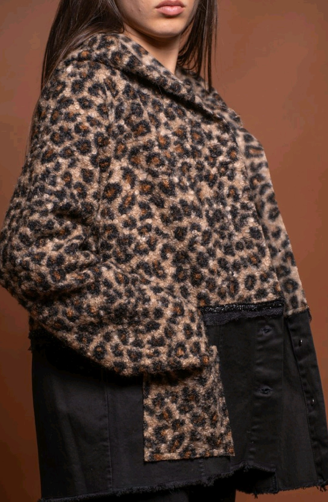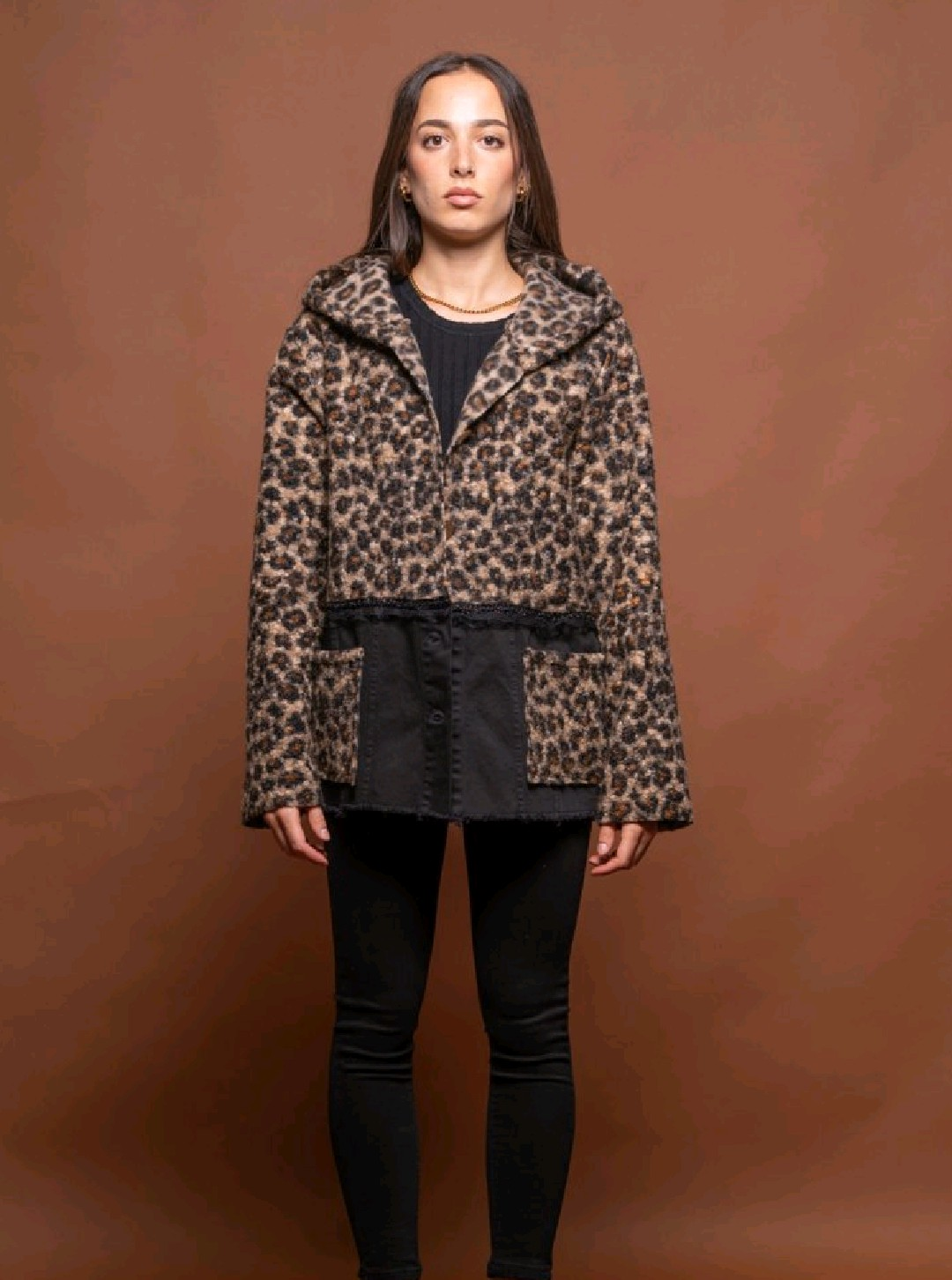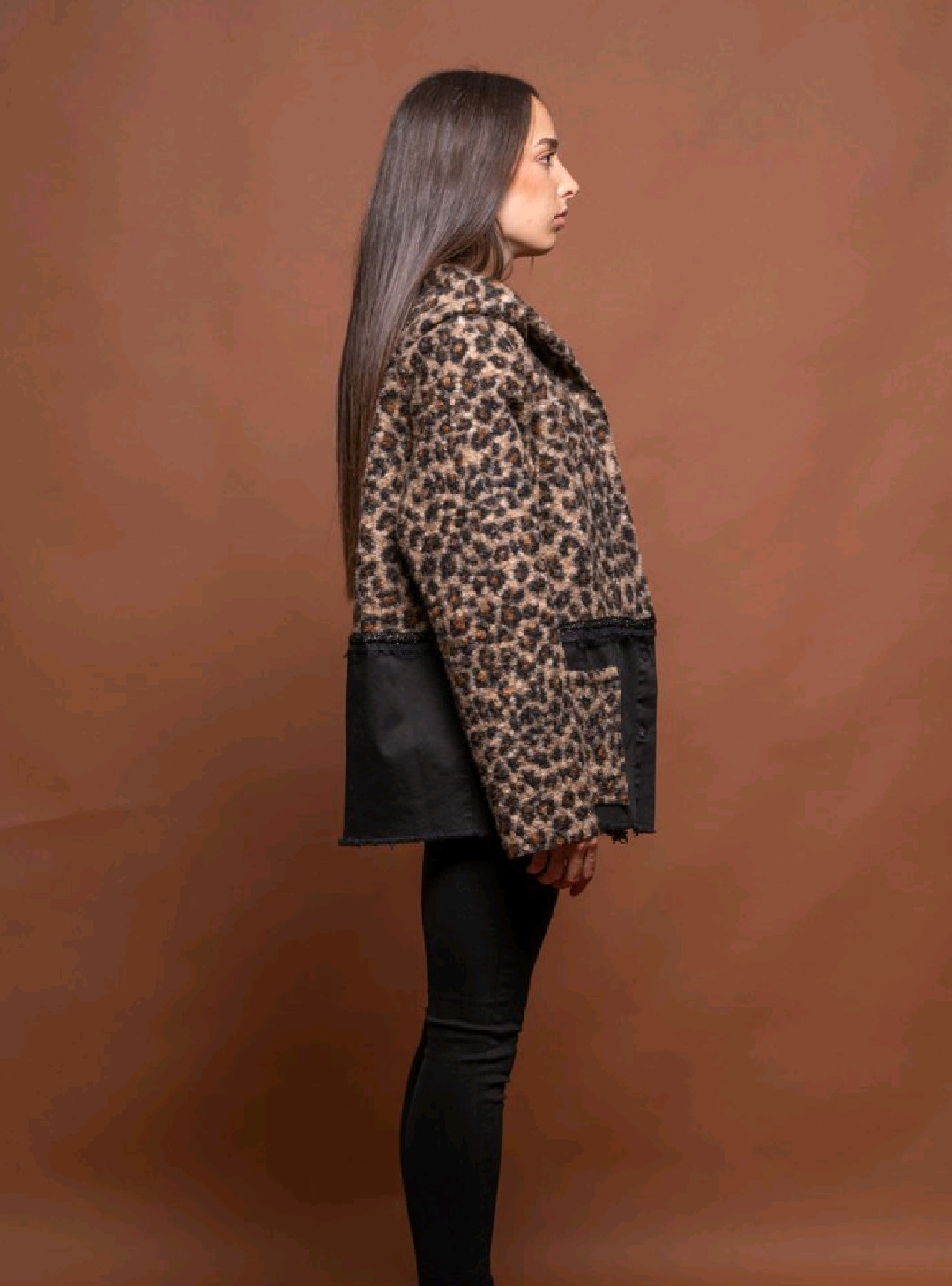A cozy oversized jacket with a bold leopard print, contrasted by solid black fabric details and patch pockets. Stylish and warm, perfect for everyday wear with a statement twist.