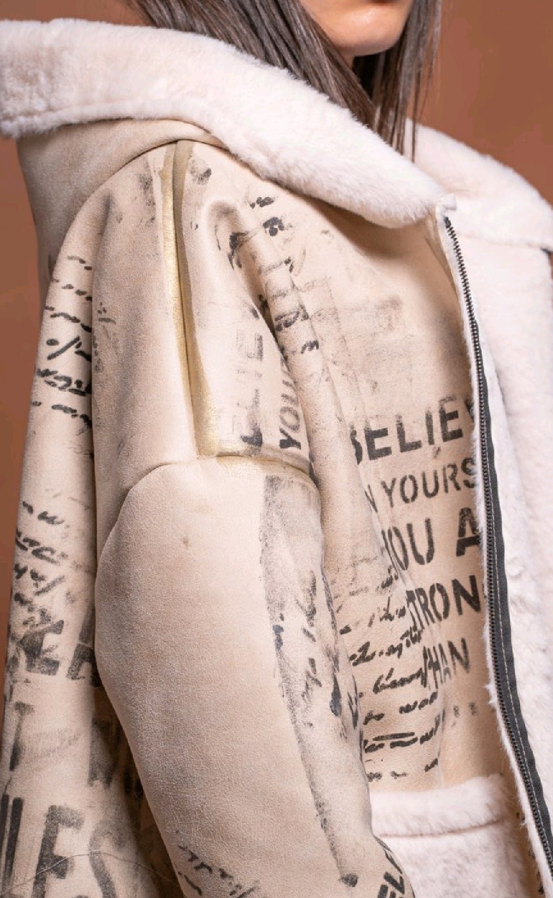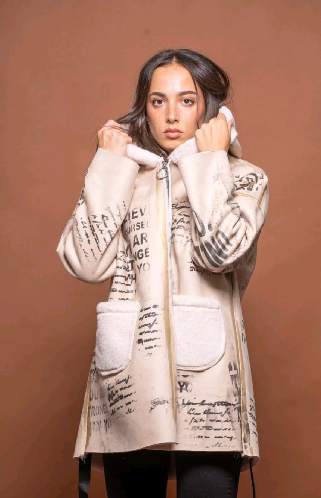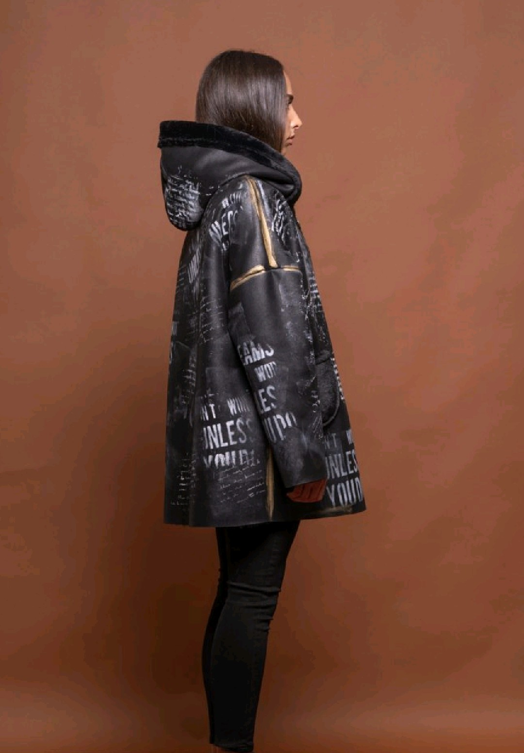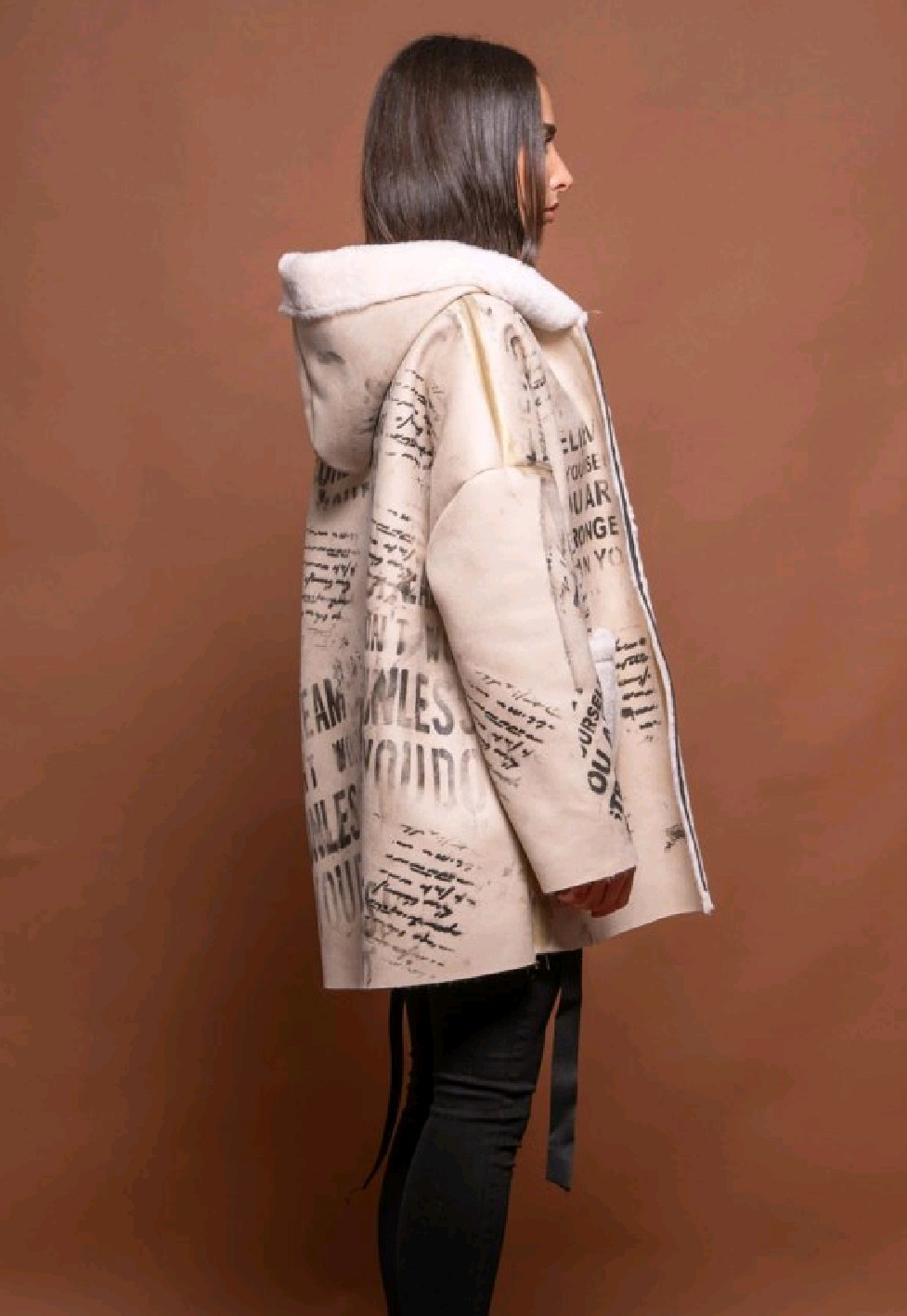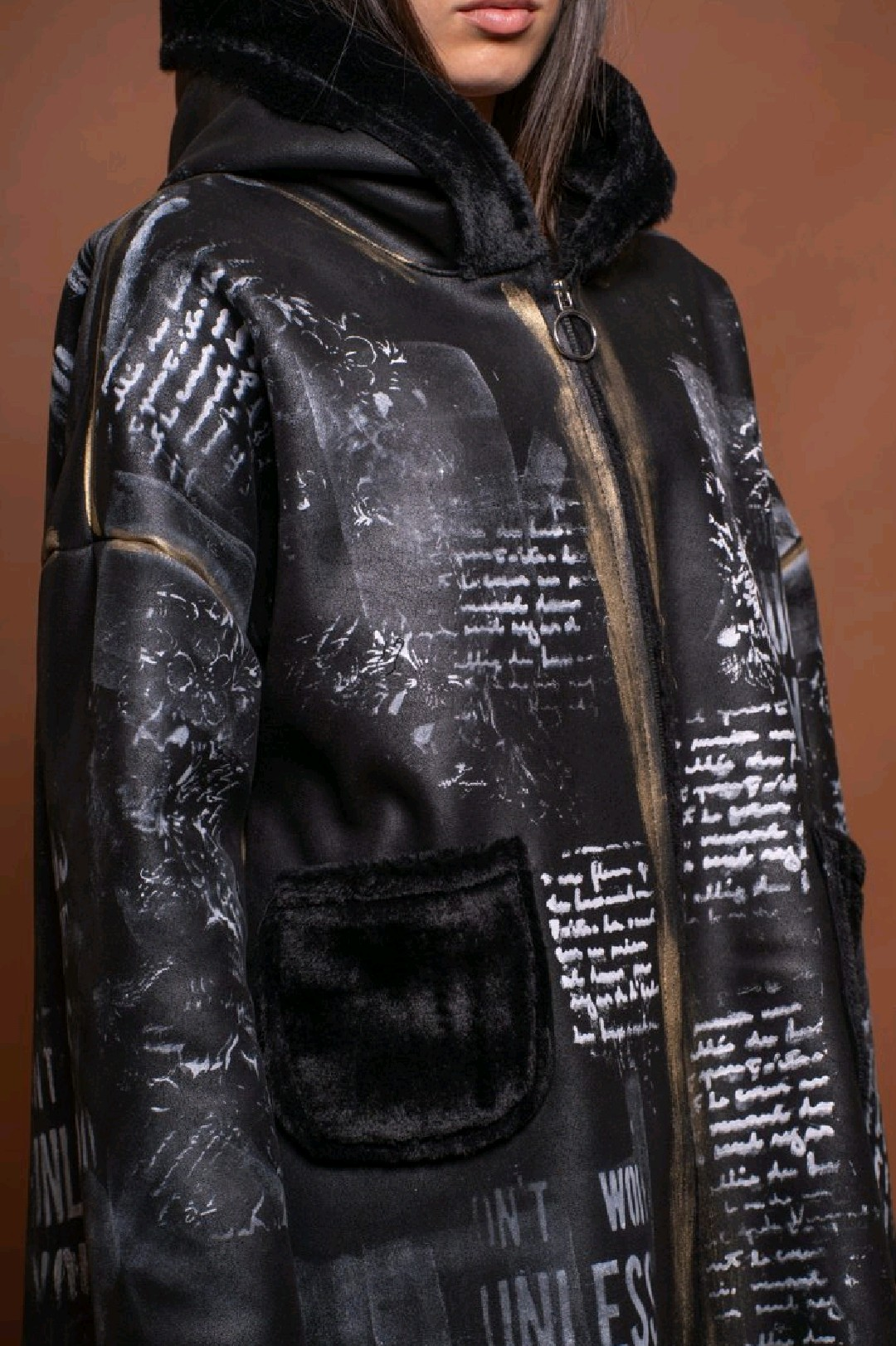 This Italian designer reversible jacket offers two distinct styles in one. One side is made of luxurious black faux fur, giving a soft and elegant finish. The reverse side showcases an artistic printed design with handwritten text and abstract patterns, enriched with metallic brushstroke accents for a bold contemporary touch. Featuring a hood, front zip closure, and patch pockets, this jacket combines comfort with standout design. A versatile piece, perfect for switching effortlessly between casual chic and statement streetwear looks.