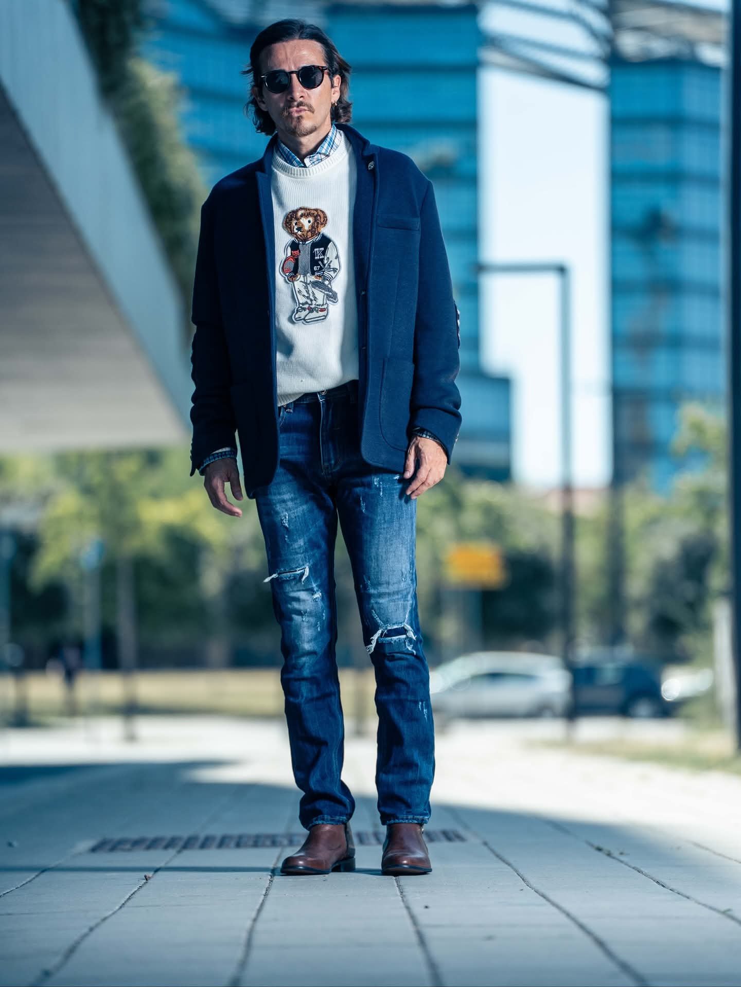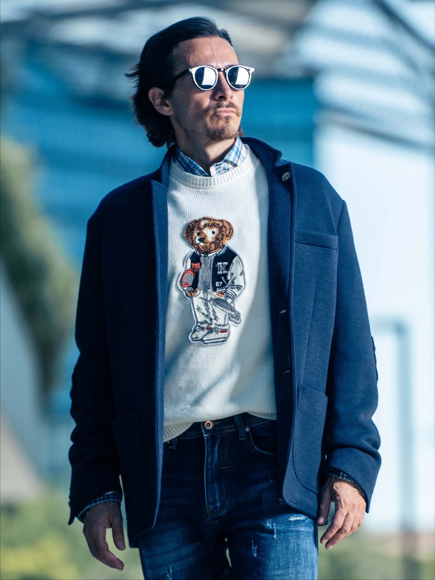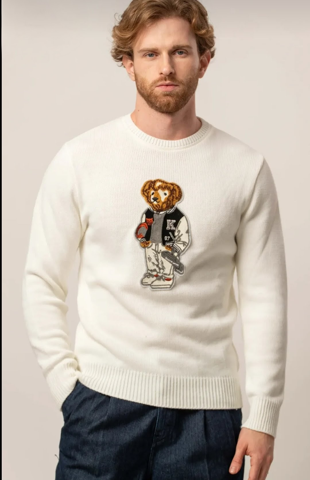 Soft white sweater with a playful teddy bear design.