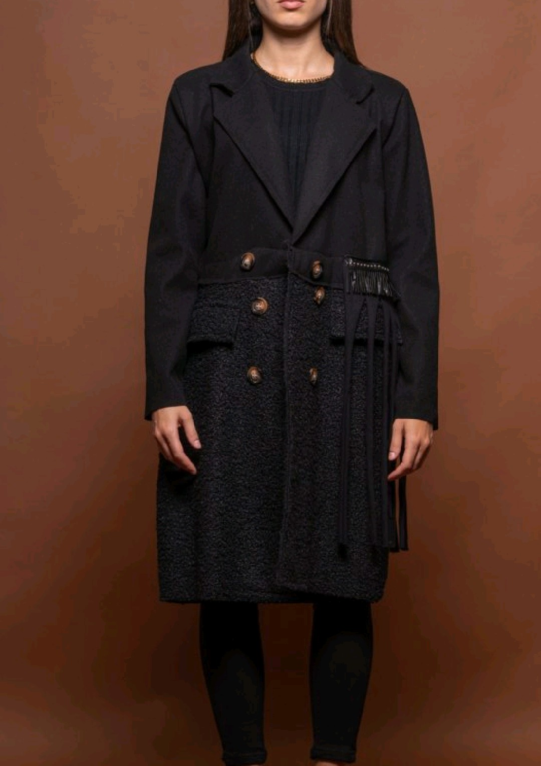 Unique black coat featuring a textured wool-blend bottom, statement fringe detailing, and double-breasted buttons. A bold and stylish piece perfect for modern layering.