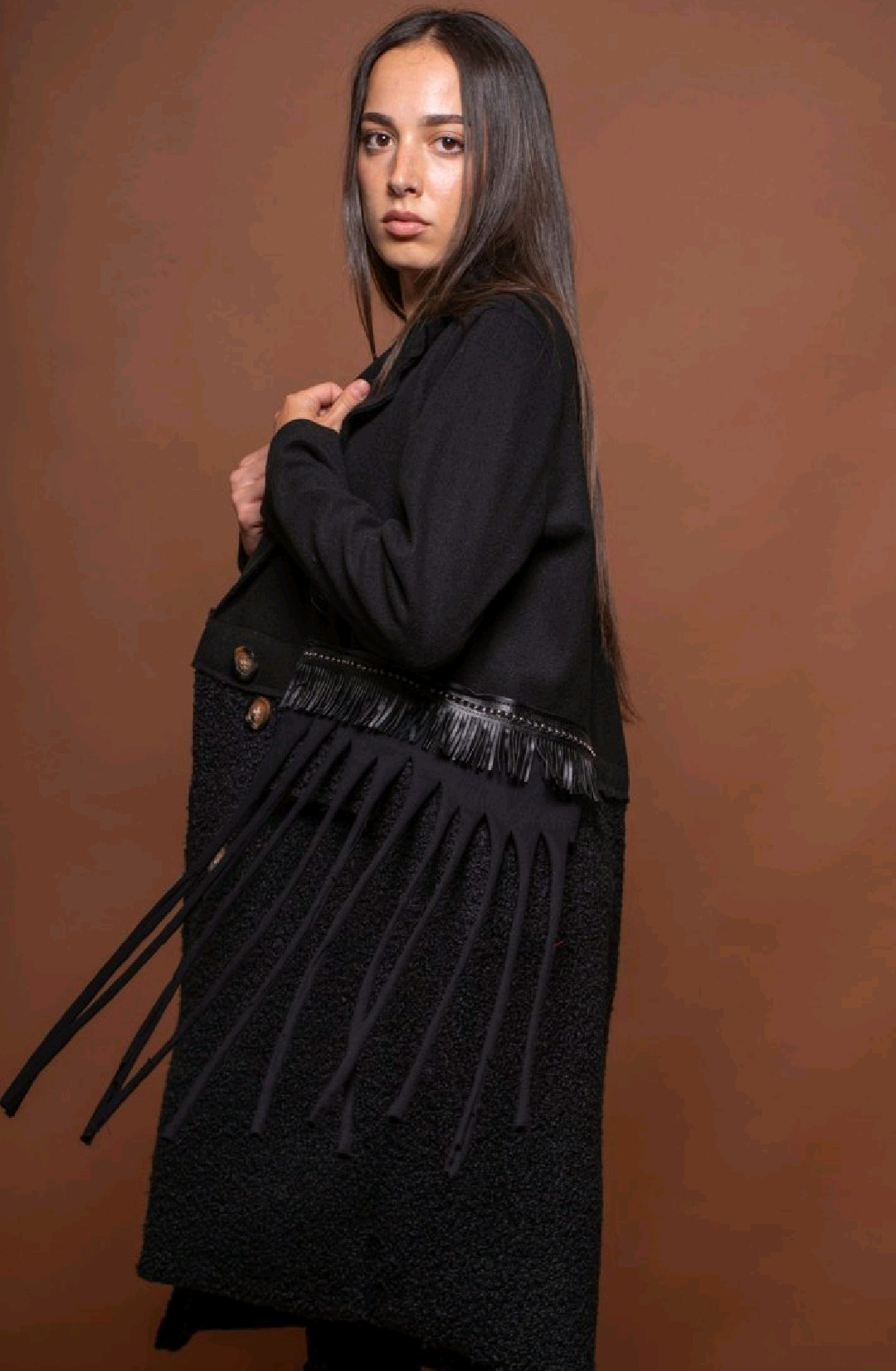Long black fringe coat.